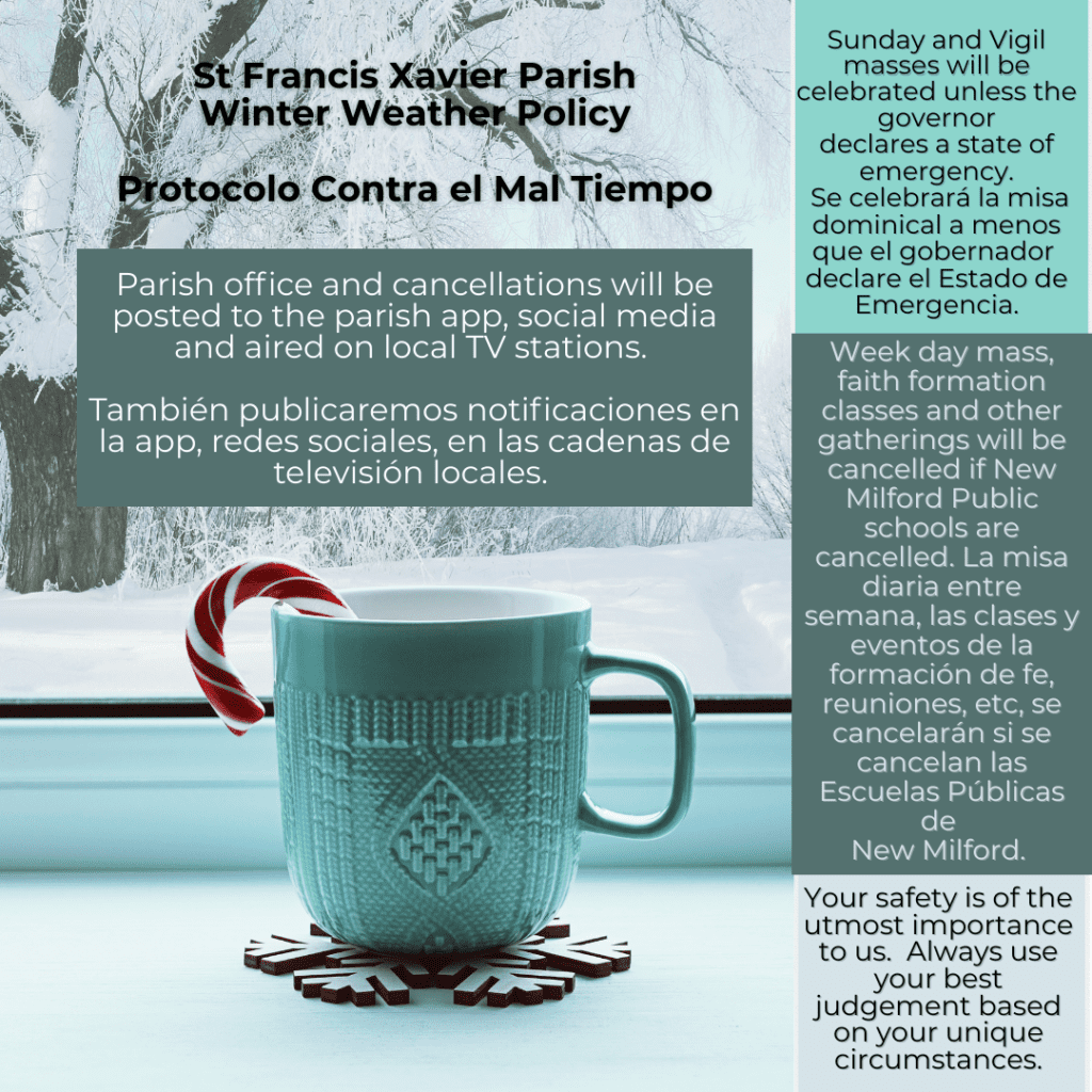 Parish office and cancellations will be posted to the parish app, social media and aired on local TV stations.